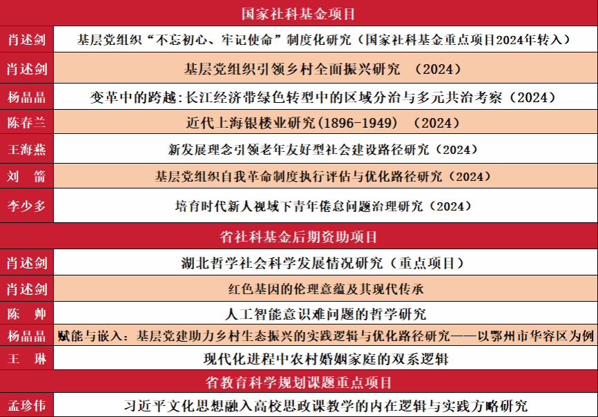 2024年学院引进青年博士4名,全部为B类引进。组建中国共产党政党理论、中国共产党历史、党的建设和党的领导等三个学科方向团队。初步探索形成了“以校基金为牵引、绩效分配为抓手、成果考核为手段”的学科方向负责人和学术骨干培养体系。肖述剑获得湖北省“荆楚好老师”荣誉称号,李静获得学校“最美教师”称号。5月,学院基层党支部换届工作圆满完成,通过精心组织和严格程序,选优配强各支部书记,确保了“双带头人”制度的有效实施,进一步强化了基层党支部战斗堡垒的核心作用。