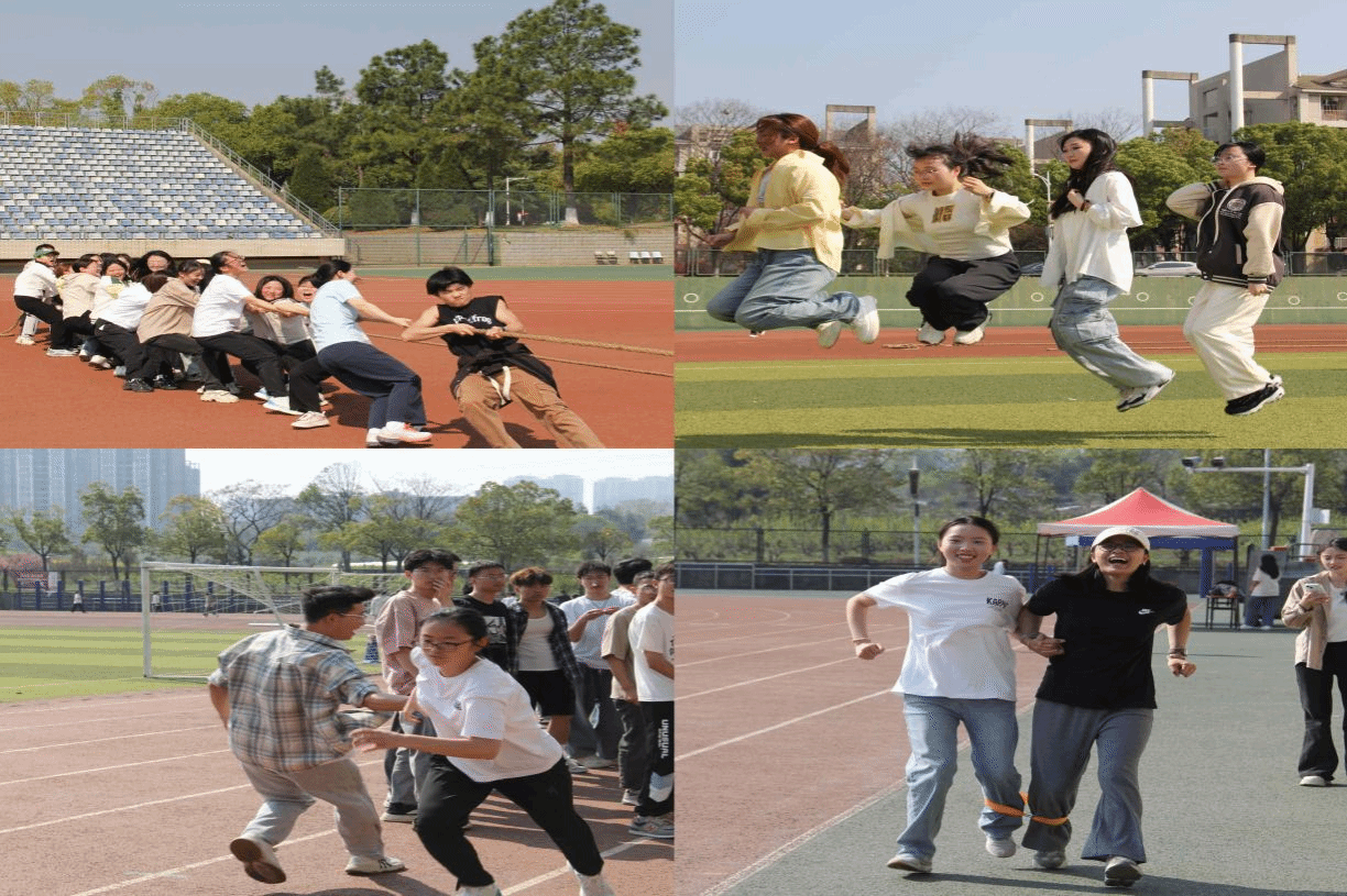 本次趣味运动会精心设计了5个趣味性与竞技性兼具的团体项目,让同学们在轻松愉快的氛围中感受运动的快乐。“一圈到底”项目充满创意,队员们灵活穿梭,传递呼啦圈,智慧与协作并重,现场气氛热烈欢腾;“两人三足”比赛考验默契配合,参赛选手们相互扶持,步伐一致,携手冲向终点,引得现场笑声不断;“接力跑”项目点燃全场热情,运动员们如离弦之箭般在跑道上飞驰;“跳绳大挑战”以个人速度和团队接力相结合,选手们身姿轻盈,跳绳翻飞,展现了青春活力;在“拔河”比赛中,所有队伍共同分为了两支,运动员们紧握长绳,齐心协力,口号声、呐喊声此起彼伏,展现了团结一心的拼搏精神。