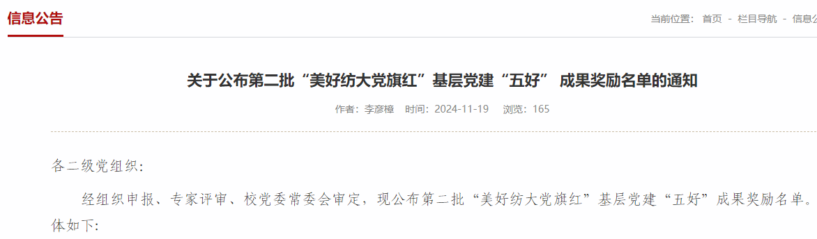 公告链接:关于公布第二批“美好纺大党旗红”基层党建“五好” 成果奖励名单的通知-5845cc威斯尼斯人官网版组织部(党校) https://zzb.wtu.edu.cn/nr.jsp?urltype=news.NewsContentUrl&wbtreeid=1031&wbnewsid=4182